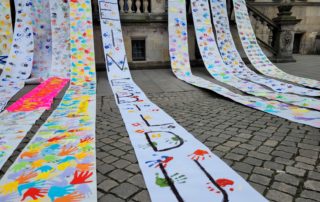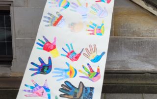 Am Mittwoch, den 26.4.23, demonstrierten zahlreiche Eltern und Schüler:innen auf dem Bremer Marktplatz für eine bessere Bildung. Darunter waren natürlich auch Teilnehmer:innen von der St.-Pius-Schule. Zuvor hatten die Schüler:innen der Klassen 1 bis 4 im Kunstunterricht farbige Hände angefertigt. Diese wurden dann visuell ausdrucksstark auf dem Marktplatz mit den Handabdrücken der anderen Schulen präsentiert.