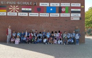 Die Einschulungsfeier begann in der St.-Pius-Kirche mit einem Wortgottesdienst. Die Klassen 2 und 3 begrüßten die neue Klasse anschließend mit verschiedenen Darbietungen. Danach gingen die SchulanfängerInnen mit ihrer Klassenlehrerin Frau Oldenburg-Stich in ihren Klassenraum zu ihrer ersten Unterrichtsstunde.