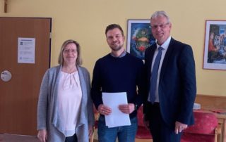 Am Mittwoch, den 24.5.23, wurde Herr Sohmen zum neuen Konrektor der St.-Pius-Schule ernannt. Der Schulrat der Schulstiftung, Herr Diekmann, war aus Osnabrück nach Bremen gekommen, um im feierlichen Rahmen die offizielle Urkunde zu überreichen. Gemeinsam mit dem Kollegium und den Elternvertreter:innen der verschiedenen Klassen konnte dann angestoßen werden, zudem konnten sich alle Anwesenden an einem kleinen Büfett stärken. Herr Sohmen freut sich anlässlich seiner neuen Aufgabe als stellvertretender Schulleiter gemeinsam mit der Direktorin Frau Kahle auf eine gute zukünftige Zusammenarbeit an der St.-Pius-Schule.